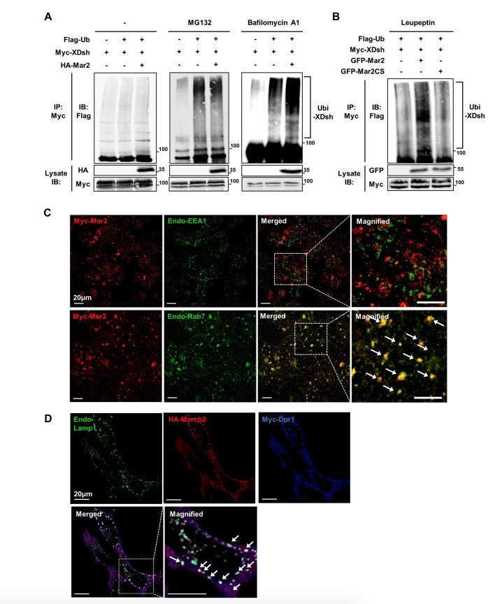 Fig. 3. March2 mediates Dsh for the lysosomal degradation pathway. (A,B) In vivo ubiquitylation assays in Xenopus. XDsh was pulled down with anti-Myc antibody and its ubiquitylation was detected by anti-Flag antibody. Poly-ubiquitylated Dsh protein was increased by March2 with bafilomycin A1 (A) or leupeptin (B) treatment. (C) Confocal images of Xenopus tissues showing the subcellular localization of March2 protein. Animal caps injected with Myc-Mar2 mRNA (200 pg) were immunostained with anti-EEA1 or Rab7 antibodies and analyzed. White arrows indicate colocalized puncta of March2 with Rab7. (D) Confocal images of HeLa cells showing colocalization of March2 and Dpr1 in Lamp1-positive puncta (white arrows).