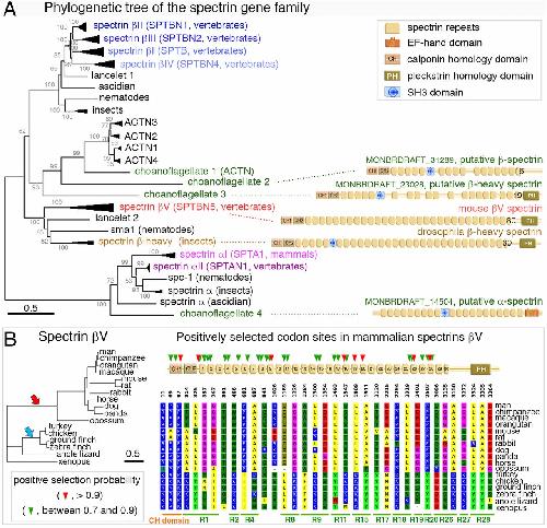Spectrin family tree and signatures of positive selection in the amino acid sequences of mammalian spectrins βV. (A) Neighbor-joining phylogenetic tree of the complete spectrin gene family based on a multiple full-length sequence alignment from vertebrate and invertebrate species (Jones–Taylor–Thornton amino acid substitution model). Vertebrate spectrin branches were collapsed for the sake of clarity (see detailed tree in SI Appendix, Fig. S7). Predicted domains of the spectrins identified in the choanoflagellate Monosiga brevicollis are shown on the right side of the corresponding tree branches: MONBRDRAFT_14504, _31289, and _23028 refer to the putative α, β, and β-heavy (βH) spectrins, respectively. The nonconventional β spectrins of Drosophila (β-heavy) and mouse (βV) are shown for comparison. Bar, 0.5 substitution per site. (B) Diagram showing the positions of the amino acid residues submitted to positive selection in the mammalian lineage for spectrin βV (35 codon sites). Corresponding positions in the different vertebrate species are shown, with upper numbers indicating the positions in the human protein sequence. The protein domains are indicated below by horizontal bars. The phylogenetic tree of this spectrin is shown on the left side (the red and blue arrows indicate the mammalian and avian focal branches, respectively). Bar, 0.5 substitution per site. The detailed results of the phylogenic molecular analysis are presented in SI Appendix, Table S2. CH, calponin homology domain; Rn, spectrin repeat number n; PH, pleckstrin homology domain. |