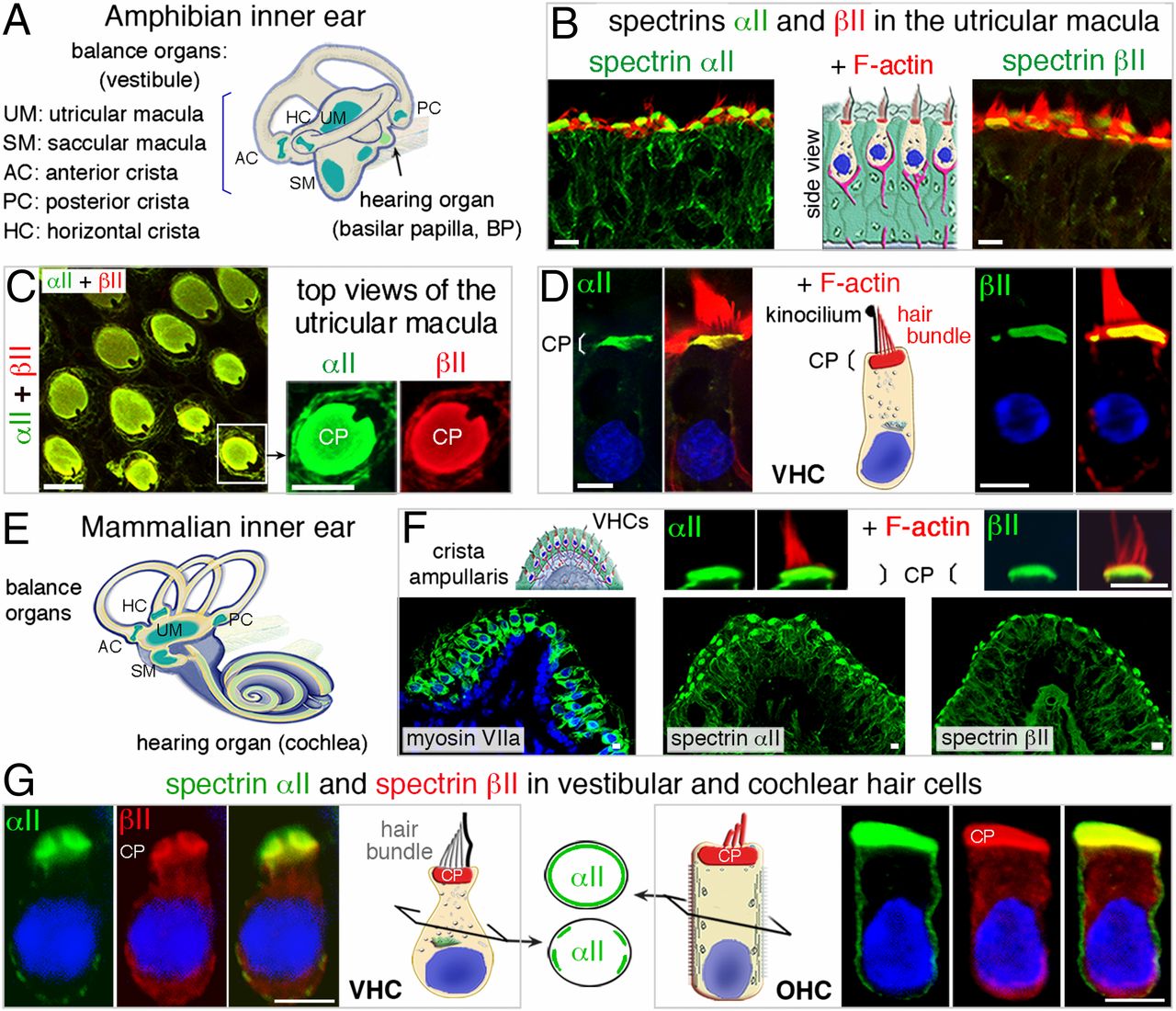 utricular macula. Among conventional spectrins, only spectrins αII (green) and βII (red) are present