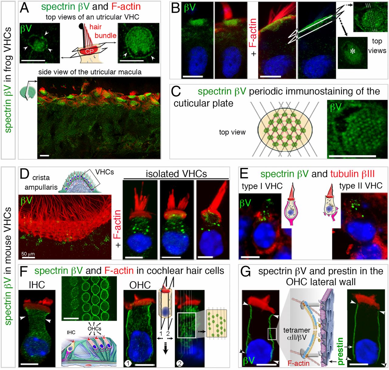 Distinct subcellular distributions of spectrin βV in the frog and mouse hair cells. (AâC) Frog (X. laevis). (A and B) In the vestibular hair cells (VHCs) of a frog utricular macula, spectrin βV (green) is invariably detected both in the cuticular plate (CP) and as an apical immunoreactive peripheral ring (arrowheads in A). The top views in B show spectrin βV labeling just above and under (asterisk) the cuticular plate. (C) At the CP apical surface, the spectrin βV immunostaining forms a well-organized punctate pattern, with seemingly uniformly spaced dots resembling lattice knots. (DâG) Mouse. (D and E) In the VHCs of a mouse crista ampullaris, spectrin βV is detected as a cytoplasmic punctate immunostaining both in type I and type II VHCs, which can be differentiated by the tubulin βIII immunolabeling of their afferent nerve fibers. Spectrin βV-immunoreactive puncta extend from the apical region near the cuticular plate down to the supranuclear region of the VHCs. (F and G) In the cochlea, spectrin βV is present both in inner hair cells (IHCs) and outer hair cells (OHCs). Note that the immunostaining of the IHC lateral wall is restricted to the neck region (arrowheads), whereas the protein is detected in (and restricted to) the entire lateral wall of OHCs, where it contributes to the cortical lattice (see diagrams) (F). (G) In the OHCs, the spectrin βV immunostaining matches the distribution of the lateral plasma membrane protein prestin (arrowheads). Bars, 5 µm. |