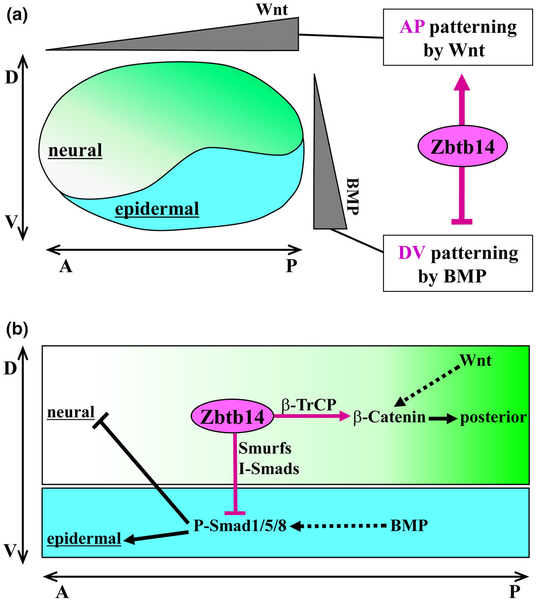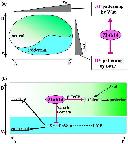 FIGURE5 Zbtb14 coordinates the establishment of DV and AP axes in Xenopus. (a) By the early neurula stage, neural tissue is formed on the dorsal side of the embryonic ectoderm by BMP antagonists, and then regionalized into the future fore- , mid- and hindbrain and the spinal cord along the AP axis by posteriorizing signals such as Wnt. Zbtb14 promotes neural induction and inhibits epidermal differentiation by inhibiting BMP signaling, thereby regulating DV patterning. In addition, Zbtb14 promotes the formation of posterior neural tissues and suppresses anterior neural development by modulating Wnt signaling. (b) Mechanistically, Zbtb14 reduces the level of both total and phosphorylated Smad1/5/8 proteins to suppress BMP signaling and also induces an accumulation of β- Catenin to promote Wnt signaling by associating with Smurfs/I- Smads (Smad6 and Smad7) and β- TrCP, respectively. Zbtb14 plays a crucial role in the formation of DV and AP axes by regulating both the BMP and Wnt pathways during early Xenopus embryogenesis. |