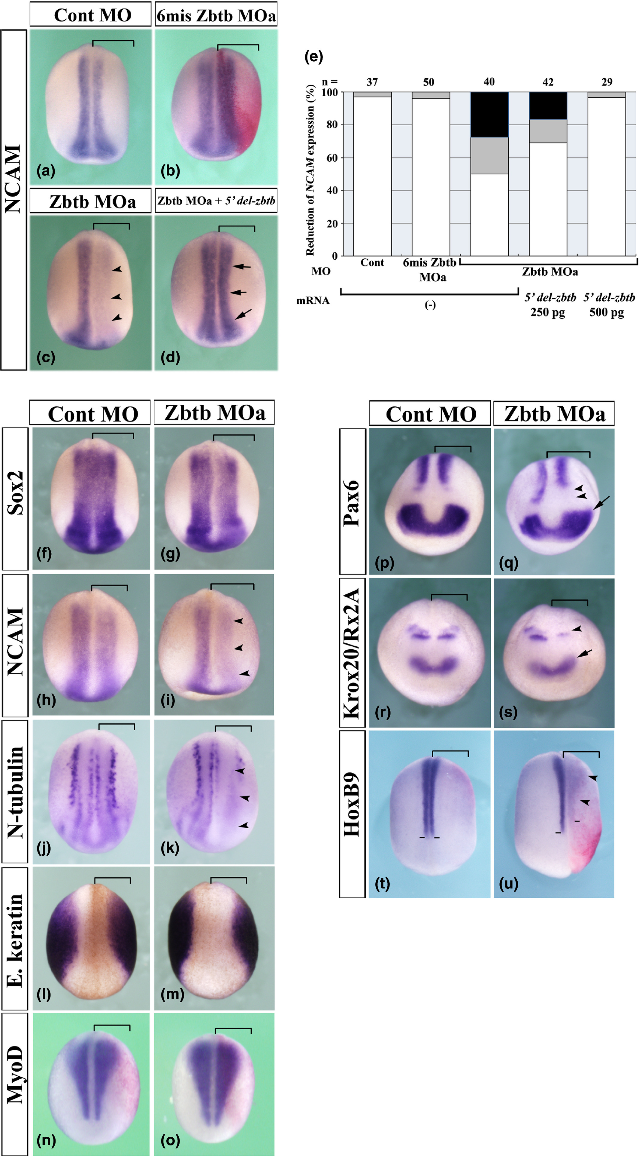 FIGURE 3âZbtb14 is required for formation of posterior neural tissue and suppression of anterior neural development. (aâd) With or without β-gal mRNA, 35 ng of Control MO (a; Cont MO), 6mis Zbtb14 MOa (b), Zbtb14 MOa (c) or Zbtb14 MOa with 500 pg of 5â² del-zbtb14 mRNA (d) was injected unilaterally into 2- cell- stage embryos. Expression of ncam analyzed by whole- mount in situ hybridization is shown in purple and β- Gal is stained in red. The injected side was identified by either β- Gal staining or fluorescence signal (See Materials and Methods for details). In embryos injected with Zbtb14 MOa, expression of ncam on the injected side was severely reduced (arrowheads in c) and 5â² del-zbtb14 significantly rescued the reduction of ncam expression induced by Zbtb14 MOa (arrows in d). The injected side of the embryo is indicated by brackets. All panels show dorsal views with posterior to the top. (e) Summary of phenotypes obtained from several repeats of the experiments shown in (aâd). The degree of recovery in the ncam expression domains was scored and categorized into three types: â , Severely; , Weakly; â¡, unchanged. Numbers of embryos per experimental group are indicated above the bars. (fâu) Together with β-gal mRNA, either Cont MO (35 ng, left columns) or Zbtb14 MOa (35 ng, right columns) was injected unilaterally into 2- cell- stage embryos. Expression of sox2 (early neural marker, f and g), ncam (late neural marker, h and i), n-tubulin (differentiated neuronal marker, j and k), epidermal keratin (E. keratin) (epidermal marker, l and m), myod (paraxial mesoderm marker, n and o), pax6 (neural plate and eye field marker, p and q), krox20 (hindbrain marker)/rx2a (eye field marker, r and s), and hoxb9 (spinal cord marker, t and u) genes analyzed by whole- mount in situ hybridization are shown in purple and β- Gal is stained in red. In embryos injected with Zbtb14 MOa, expression of ncam and n-tubulin on the injected side is reduced; however, expression of sox2 is not significantly reduced. The expression pattern of myod is not significantly affected by Zbtb14 MOa. Expression of rx2a on the injected side is expanded, whereas that of krox20 is reduced (s). Expression of hoxb9 is also decreased and shifted posteriorly (horizontal lines mark approximate anterior limits of hoxb9 expression; u). In accordance with these observations, the spinal cord expression of pax6 is suppressed (arrowheads), while the anterior expression domains of pax6 and rx2a are expanded toward the posterior and lateral sides (arrows) (q and s). The injected side of the embryo is indicated by brackets. All panels show dorsal views with posterior to the top, except for pax6 and krox20/rx2a, which show anterior (front) views with dorsal to the top.