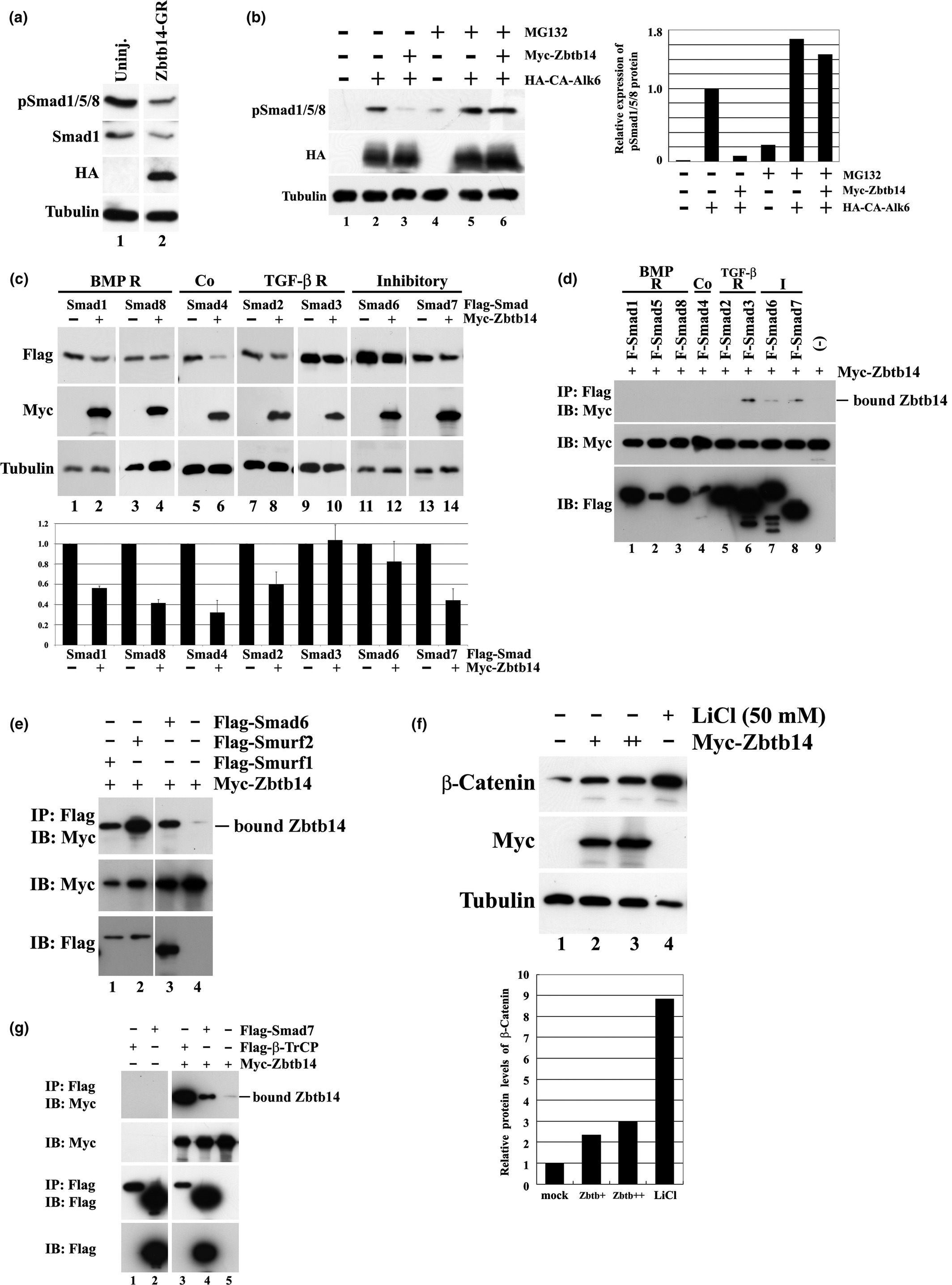 FIGURE 4âZbtb14 regulates BMP and Wnt signaling. (a) Zbtb14 decreases endogenous levels of phosphorylated Smad1/5/8 in Xenopus ectodermal cells. zbtb14-GR mRNA (250 pg) was injected into the animal region of 4- to 8- cell- stage embryos. Embryos were treated with DEX, and ectodermal explants were isolated at the blastula stage and cultured until the early gastrula stage (stage 10.5). Whole- cell lysates from explants were immunoblotted with anti- phospho Smad1/5/8 (pSmad1/5/8), anti- Smad1 (MO5), anti- HA, and anti- Tubulin antibodies, respectively. Zbtb14- GR was tagged at the C- terminus with the HA epitope. Tubulin was used as a loading control. (b) Zbtb14 decreases levels of pSmad1/5/8 induced by the constitutive active BMP receptor HA- CA- Alk6 in cultured HeLa cells. The effect of Zbtb14 depends on the proteasomal degradation pathway, which is inhibited by the proteasome inhibitor MG132. HeLa cells were transfected with the indicated combination of expression constructs, and then treated with or without MG132 for 6 hr before cell harvest. Whole- cell extracts were immunoblotted with the indicated antibodies. Tubulin was used as a loading control. Graph (right) shows quantification of the pSmad1/5/8 immunoblot which was normalized to Tubulin (left). (c) Zbtb14 decreases protein levels of BMP- regulated Smads (Smad1 and Smad8), Co- Smad (Smad4), TGF- β- regulated Smad (Smad2), and I- Smads (Smad6 and Smad7). COS cells were transfected with the indicated combination of expression constructs. Whole- cell extracts were immunoblotted with the indicated antibodies. Tubulin was used as a loading control. (d) Zbtb14 interacts with the R- Smad Smad3 and I- Smads (Smad6 and Smad7). COS cells were transfected with the indicated combination of expression constructs, and then treated with MG132 for 6 hr before harvest. Flag- tagged Smads (F- Smads) were immunoprecipitated (IP) from cells lysates with anti- Flag antibodies, and the precipitates were immunoblotted (IB) with anti- Myc antibodies (top). Input cells lysates were immunoblotted with anti- Myc (middle) or anti- Flag (bottom) antibodies. Interactions of Zbtb14 with Smad3, Smad6, and Smad7 were repeatedly observed in independent experiments (e and g; data not shown). (e) Zbtb14 interacts with Smurf1 and Smurf2. COS cells were transfected with the indicated combination of expression constructs, and then treated with MG132 for 6 hr before harvest. Flag- tagged Smads were immunoprecipitated from transfected cells with anti- Flag antibodies, and the precipitates were immunoblotted with anti- Myc antibodies (top). Input cells lysates were immunoblotted with anti- Myc (middle) or anti- Flag (bottom) antibodies. (f) Zbtb14 stabilizes cytosolic β- Catenin, which transduces canonical Wnt signaling. COS cells were transfected with Myc- tagged Zbtb14 and cell lysates were incubated with concanavalin A (Con A) beads to enrich free cytosolic β- Catenin by removing cadherin- bound β- Catenin. Input extracts were immunoblotted with anti- Myc (middle) or anti- Tubulin as a loading control (bottom). Graph (bottom) shows quantification of the immunoblot (top) which was normalized to Tubulin. (g) Zbtb14 interacts with β- TrCP as well as with Smad7. COS cells were transfected with the indicated combination of expression constructs, and then treated with MG132 for 6 hr before harvest. Flag- tagged constructs were immunoprecipitated from cells lysates with anti- Flag antibodies, and the precipitates were immunoblotted with anti- Myc antibodies (top panel). Input extracts were immunoblotted with anti- Myc antibodies (second panel) or anti- Flag antibodies (bottom panel). Extracts were also immunoprecipitated with anti- Flag and then immunoblotted with anti- Flag antibody (third panel), in order to detect β- TrCP, which is expressed at low levels. |