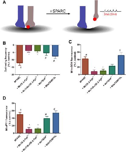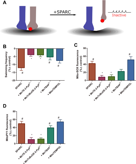 Fig. 3. SPARC induced motor deficits are redox regulated. (A) SPARC mechanism of action scheme. SPARC binds to weak synaptic inputs to selectively induce pruning—via a yet to be fully elucidated mechanism. Withdrawing inputs (retraction bulbs) are inactive; hence, global SPARC treatment can silence multiple NMJs to induce motor deficits. (B) Evoked swimming frequency (expressed as %δ control) by condition (SPARC, SPARC plus: MnTE-2-PyP5+, MnTnBuOE-2-PyP5+, MnTBAP3- or MitoTempol; n = 10 in each condition). (C) Mito-SOX oxidation (expressed as %δ control) by condition (n = 10 per condition). (D) MitoPY1 oxidation (expressed as %δ control) by condition (n = 10 per condition). Error bars are SEM. Concentrations and incubations: SPARC (50 nM for 30 min), MnTE-2-PyP5+, MnTnBuOE-2-PyP5+, MnTBAP3- conditions = 1 µM for 30 min. MitoTempol = 20 µM for 30 min. # denotes significant difference vs control. * denotes significant difference vs SPARC. |