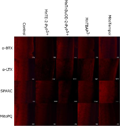 Supplementary Fig. 2. Representative florescent images of Mito-SOX oxidation in vivo by synaptic inactivity model (α-BTX, α-LTX, SPARC and MitoPQ) and treatment condition (control, MnTE-2-PyP5+, MnTnBuOE-2-PyP5+, MnTBAP3- and Mito-Tempol) taken from the intermyotomal region of stage 37–38 X. laevis tadpoles using whole-mount redox imaging. Scale bar is 0.1 mm. |