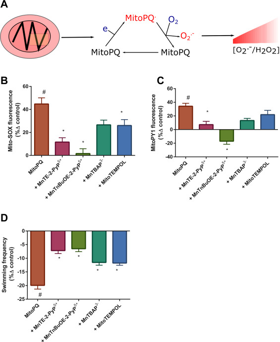 Fig. 4. MitoPQ induced motor deficits are redox regulated. (A) MitoPQ mechanism of action scheme. Within the mitochondrial matrix, MitoPQ accepts an electron from complex I to yield a MitoPQ radical. The MitoPQ radical reacts with molecular oxygen (O2) to generate O2.-, leading to an increase in matrix [O2.- and H2O2] (the latter as a consequence of MnSOD mediated O2.- dismutation). (B) Mito-SOX oxidation (expressed as %δ control) by condition (MitoPQ, MitoPQ plus: MnTE-2-PyP5+, MnTnBuOE-2-PyP5+, MnTBAP3- or MitoTempol n = 10 per condition). (C) MitoPY1 oxidation (expressed as %δ control) by condition (n = 10 per condition). (D) Evoked swimming frequency (expressed as %δ control) by condition (n = 10 in each condition). Error bars are SEM. Concentrations and incubations: MitoPQ (5 µM for 60 min), MnTE-2-PyP5+, MnTnBuOE-2-PyP5+, MnTBAP3- conditions = 1 µM for 30 min. MitoTempol = 20 µM for 30 min. #denotes significant difference vs control. *denotes significant difference vs MitoPQ. |
