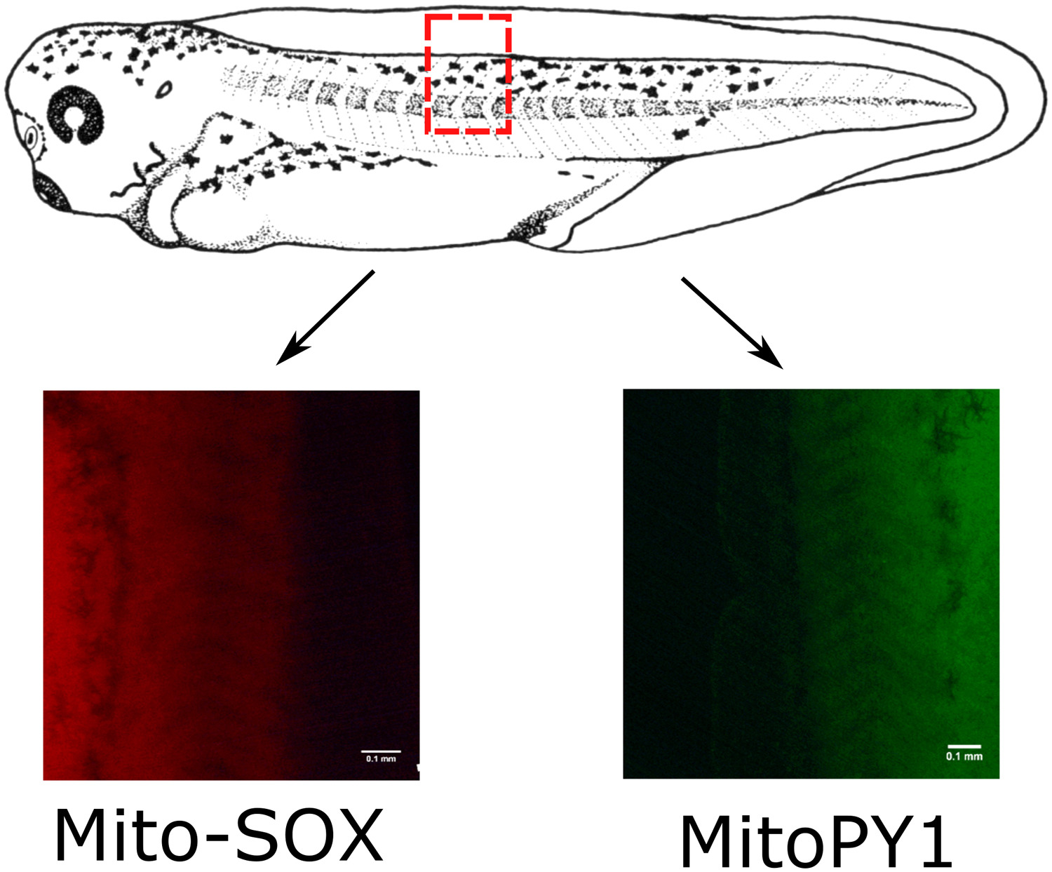 Supplementary Fig. 4. A stage 37â38 X. laevis tadpole with the location of a representative intermyotomal region sampled (red box) with florescent images of Mito-SOX and MitoPY1 oxidation shown below. |