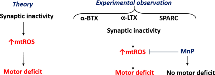 Fig. 2. α-LTX induced motor deficits are redox regulated. (A) α-LTX mechanism of action scheme. α-LTX binds to nerve terminals to cause mass neurotransmitter vesicle depletion, leading to pre-synaptic inactivity. (B) Evoked swimming frequency (expressed as %δ control) by condition (α-LTX, α-LTX plus: MnTE-2-PyP5+, MnTnBuOE-2-PyP5+, MnTBAP3- or MitoTempol; n = 10 in each condition). (C) Mito-SOX oxidation (expressed as %δ control) by condition (n = 10 per condition). (D) MitoPY1 oxidation (expressed as %δ control) by condition (n = 10 per condition). Error bars are SEM. Concentrations and incubations: α-LTX (15 nM for 30 min), MnTE-2-PyP5+, MnTnBuOE-2-PyP5+, MnTBAP3- conditions = 1 µM for 30 min. MitoTempol = 20 µM for 30 min. # denotes significant difference vs control. * denotes significant difference vs α-LTX. |