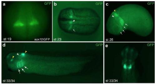 FIGURE 2 Spatial and temporal domains of the sox10:GF P reporter expression during development. GFP reporter expression in Tg(sox10:GFP) embryos at different stages. a, b, stages 19, 23 . White arrowhead in b marks hindbrain expression, the arrow points to migrating NC cells. c, stage 25. Major cranial migratory streams are indicated by arrows, white arrowhead points to the otic vesicle, yellow arrowhead to the hindbrain domain. d, stage 33/34. GFP fluorescence is visible in the otic vesicle (white arrowhead), and three branchial arches (arrows).Yellow arrowheads point to the expression in the eye (a positive control GFP driven by the gamma-crystallin promoter, see Methods) and the hindbrain. (c, d) Lateral view is shown, anterior is to the left. (e) stage 33/34, dorsal view. Strong GFP signal remains in the hindbrain,weaker signals are detected in the forebrain and the otic vesicle. |