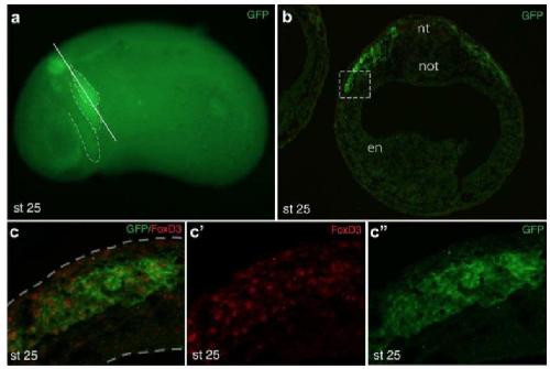 FIGURE 3 Characterization of GFP-positive cells in Tg(sox10:GFP) embryos. a, Tg(sox10:GFP) embryo ( stage 25) with GFP expression in the hindbrain and major migratory streams (dashed lines in a ). Approximate position of the section in b is shown by a solid line. b, Cross-section at the hindbrain level of a transgenic embryo double immunostained for GFP and FoxD3. Single (GFP) channel is shown. Nt, neuraltube; not, notochord; en, endoderm. c, High magnification of the boxed area in b shows that the majority of GFP-expressing cells are FoxD3-positive. Dashed lines indicate tissue boundaries. |