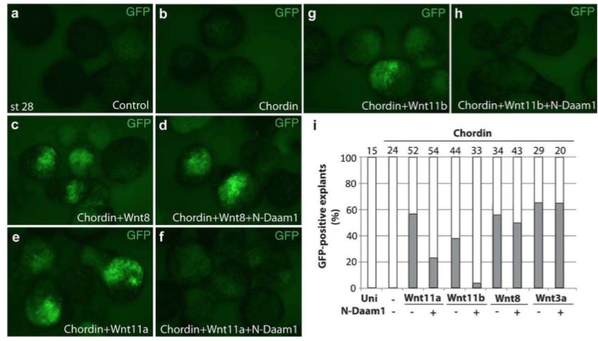 FIGURE 6 Selective inhibition of Wnt signaling by N-Daam1 in neuralized explants. Ectoderm explants were dissected at stage 9â10 from Tg(sox 10:GFP) uninjected embryos, and from those injected with indicated RNAs. The explant s were cultured until the time when control embryos reached stage 28 and were imaged (aâh). Chordin RNA was used either alone (150 pg, b) or in combination with different wntRNAs. N-Daam1 (850 pg) inhibits the response to wnt11a (2 ng, e, f), wnt11b (2ng,g,h),but not to wnt8 (700 pg, c, d) or wnt3a (525 pg, i and data not shown). i, Frequencies of GFP-positive explants (%) are representative of two different experiments. Total number of animal caps is shown above each bar. |