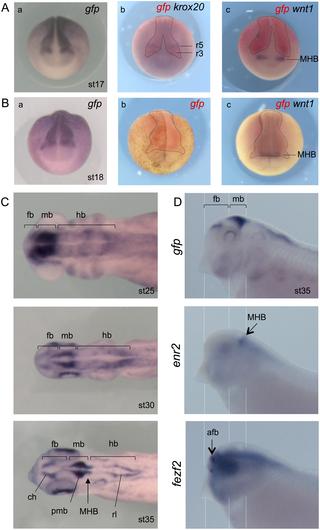 Fig 5. Wnt activity during neural tube development. (A) Anterior views of Tg(pbin7Lef-dGFP) embryos at stage 17 hybridized with probes against gfp alone (a) or gfp and krox20 or gfp (b) or gfp and wnt1(c). Dotted lines delineated the gfp staining. (B) Anterior views of Tg(pbin7Lef-dGFP) embryos at stage 18 hybridized with probes against gfp alone revealed with NBT/BCIP (a) or Fast Red (b) substrates or gfp and wnt1 (c). The same embryo is shown in b and c. Dotted lines delineate the gfp staining. (C) Dorsal views of embryos hybridized with probe against gfp at stage 25, 30 and 35. (D) Lateral views of the anterior part of embryos hybridized with probes against gfp, fezf2 or enr2 at stage 35. afb: anterior forebrain; ch: cortical hem; fb: forebrain; hb: hindbrain; mb: midbrain; MHB: Midbrain Hindbrain Boundary; pmb: posterior midbrain; r3 and r5: rhombomeres 3 and 5; rl: rhombic lip. |