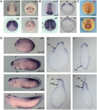 Fig 6. Wnt activity during neural crest formation. (A) Dorsal view of a stage 12 Tg(pbin7Lef-dGFP) embryo hybridized with pax3 or gfp probes (posterior side is up). Dotted shapes delineate the presumptive neural border on both sides. Anterior view of a stage 12 Tg(pbin7Lef-dGFP) embryo hybridized with otx2 probe alone or otx2 and gfp probes together (dorsal side is up). (B) Dorsal view of a stage 14 Tg(pbin7Lef-dGFP) embryo hybridized with sox2 or gfp or both probes. Dotted shapes delineate the neural plate. The a and b dotted lines indicate the level of shown transverses sections. (C) Anterior views of a stage 18 Tg(pbin7Lef-dGFP) embryo first hybridized with probe against gfp and secondarily with probe against snai2. Dotted lines delineate gfp staining. (D) In situ hybridization against gfp on stage 21â22, 24â25, 26 and 29â30 Tg(pbin7Lef-dGFP) embryos (lateral views). For each stage, the dotted line indicates the level of the shown transverse section (aâ-dâ). ma: mandibular arch; nb: neural border; NC: migrating neural crest cells; np: neural plate; PSM: posterior presomitic mesoderm. |