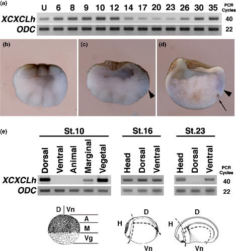 FIGURE 2.âExpression of XCXCLh. (a) Temporal expression of XCXCLh detected by RT- PCR. âUâ indicates unfertilized eggs, and the numbers indicate the developmental stages. Ornithine decarboxylase (ODC) was used as an internal control. (bâd) Whole mount in situ hybridization. Fixed embryos were bisected. Dorsal side is on the right side of the figure. Arrowheads indicate the XCXCLh signals. The arrow indicates the blastopore lip. (b) 32- cell stage. (c) Stage 8 embryo. (d) Stage 10 embryo. (e) Spatial expression patterns of XCXCLh detected by RT- PCR. Embryos were dissected at the indicated stages, and dissections were performed as indicated by the bottom panels |