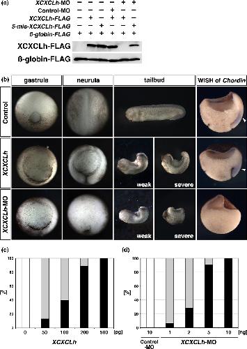 FIGURE3 Phenotypes of XCXCLh- and XCXCLh- MO- injected embryos. (a) The specificity of the antisense morpholino oligonucleotides for XCXCLh. Western blot analysis of the injected embryos at stage 10. XCXCLh- MO inhibited the translation of FLAG- tagged mRNA containingthetargetedsite.ThetranslationoftheFLAG-taggedmRNAcontaining5-mismatchedsequencesatthetargetedsitewasnot inhibited by the XCXCLh- MO. β- globin is used as a loading control. (b) XCXCLhmRNA(500pg/blastomere)orXCXCLh- MO (10 ng/blastomere) was injected into the marginal region of two dorsal blastomeres of 4- cell embryos. Gastrula, stage 12 (vegetal view). Neurula, stage 16 (dorsal view). Tailbud, stage 30 (lateral view); left, weak phenotypes; right, severe phenotypes). WISH of Chordin, whole mount in situ hybridization of bisected embryos (stage 11) with using Chordin probes. Arrowheads indicate expression of Chordin. (c, d) Effects on phenotype by increasing doses of XCXCLh (c) and XCXCLh-MO(d).Theratioofeachphenotypeintheinjectedembryos(45embryos/bar)was indicated in the graph. Black bars represent ratio of severe phenotypes as shown in B, right panels. Gray bars represent ratio of weak phenotypes as shown in B, left panels. White bars represent normal embryos |