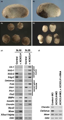 FIGURE5 The role of XCXCLh in differentiation. (A and B) Phenotypes of XCXCLh- injected embryos at stage 23. (a) Control. (b) XCXCLhmRNA(500pg/blastomere) was injected into the dorsal animal blastomeres of 8- cell embryos. (c and d) Animal caps of the injected embryos. (c) Control. (d) XCXCLh mRNA (500pg/blastomere)wasinjectedintoall animal blastomeres of 8- cell embryos, and animal caps were dissected at stage 8andcultureduntilstage25.(e)RT-PCR analysis of the animal caps of the XCXCLh- injected embryos. Total RNA was extracted from the animal caps of stage 10(leftpanels)andstage25(rightpanels)embryos. (f) RT- PCR analysis of the XCXCLh- MO- injected embryos. XCXCLh- MO (10 ng/blastomere) was injected into the vegetal region of all blastomeres of 4- cell embryos. Total RNA was extracted from the embryos (stage 16) |