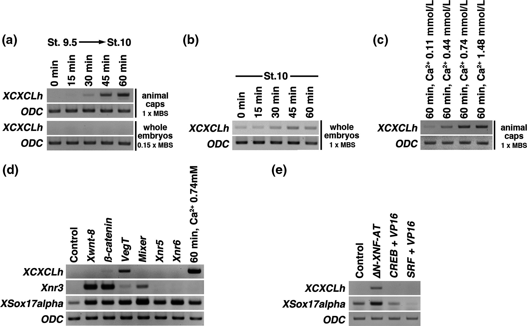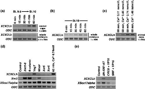 FIGURE7 Induction of XCXCLh. (a–d) RT- PCR analysis of animal caps and whole embryos. PCR cycles for XCXCLh were performed with35cycles,whichwasfewercyclesthanthatusedtodetectendogenousXCXCLh in Figure 2. (a) The time after the dissection of the animalcaps(fromstage9.5to10)isindicated.Animalcapswereculturedin1×MBS,andembryoswereculturedin0.15×MBS.TotalRNAwasextractedevery15minfromstage9.5.(b)Wholeembryoswereculturedin1×MBSduringtheindicatedtime(min)untilstage10.TotalRNAwasextractedatstage10.(c)Animalcapsweredissectedatstage9.5andculturedin1×MBSincludingtheindicatedcalciumion during 60 min until stage 10. Total RNA was extracted at stage 10. (d) Xwnt-8(0.5pg/blastomere),β-catenin (1 pg/blastomere), VegT (500pg/blastomere),Mixer(500pg/blastomere),Xnr5 (10 pg/blastomere), or Xnr6 (20 pg/blastomere) mRNAs were injected into all animal blastomeres of 8- cell embryos, and animal caps were dissected at stage 10 and immediately suspended in lysis buffer (lanes 1- 7). The animal capsweredissectedatstage9.5andculturedin1×MBSwithcalciumions(0.74mmol/L)during60min(lane8).TotalRNAwasextractedatstage 10. (e) ΔN-XNF-AT, CREB +VP16, or SRF + VP16 mRNA (100 pg/blastomere) was injected into all animal blastomeres of 8- cell embryos, and animal caps were dissected at stage 10 and immediately suspended in lysis buffer |