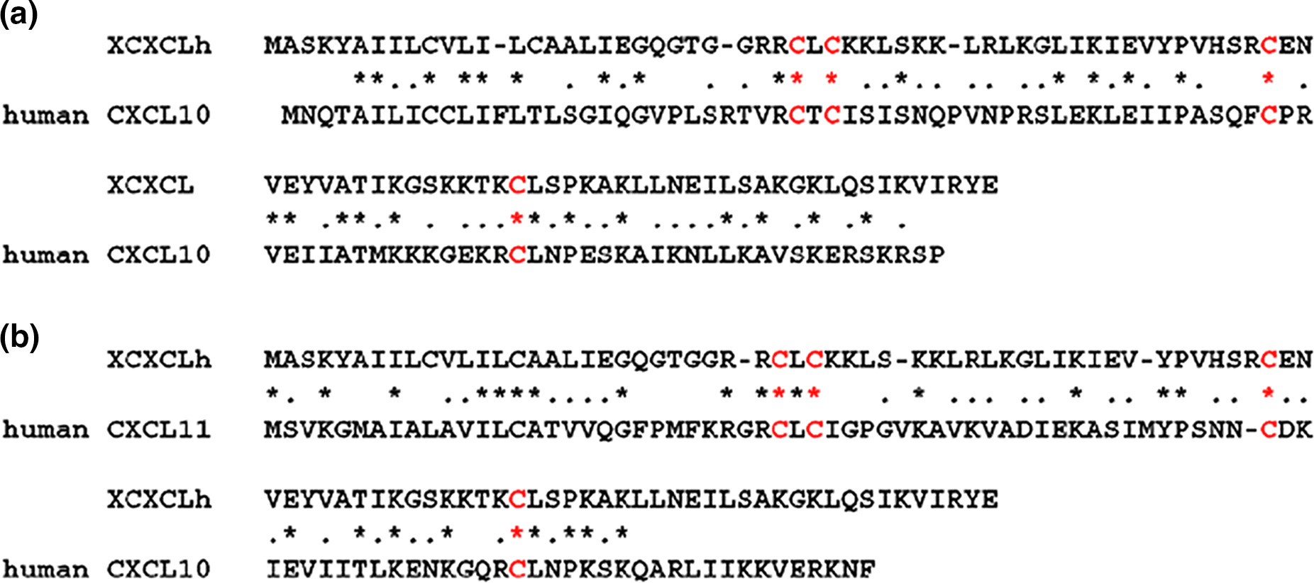 FIGURE 1âAlignment of amino acid sequences of XCXCLh, human CXCL10, and human CXCL11. The conserved amino acids are represented by asterisks (*). Red indicates the CXC- type motif. XCXCLh had a 32.6% and 33.1% sequence homology with human CXCL10 and CXCL11, respectively |