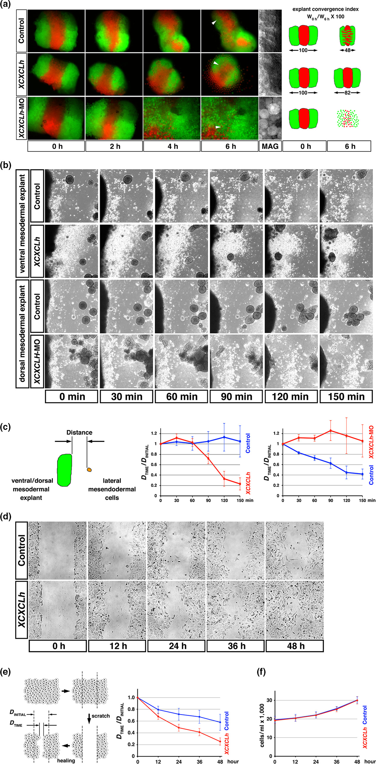 FIGURE4 The role of XCXCLh in chemotaxis. (a) Tissue convergence in three notochord explants. XCXCLh mRNA(500pg/blastomere)orXCXCLh- MO (10 ng/blastomere) with green tracer (EGFP mRNA, 100 pg/blastomere) or red tracer (mCherry mRNA, 100 pg/blastomere) was co- injected into two dorsal blastomeres of 4- cell embryos. Each notochord sector (without epithelium) was dissected from the injected embryos at stage 10. Three notochord sectors were grafted together and cultured on bovine serum albumin (BSA)- coated cover glasses. The elapsed time is indicated at the bottom. The average convergence index for three explants is indicated on the right (n = 3). The far right columns are high magnifications of the last frames (arrowheads). (b) Migration of scattered lateral mesendodermal cells. Lateral mesendodermal cells were dissected and dissociated at stage 10, and placed on fibronectin- coated cover glasses 0.2 to0.5mmfromtheXCXCLh- expressing ventral mesodermal explants or XCXCLh- MO-injected dorsal mesodermal explants. Mesodermal explants were placed on the left side. The elapsed time is indicated at the bottom. (c) Left, schematics of experiments. Right, the ratio of mesendodermal cell migration (n = 10). The ratio of the distance between mesodermal explants and lateral mesendodermal cells was measured every 30 min, and the average ratio is shown by the blue line for the control and red line for the XCXCLh-expressing or XCXCLh- MO- injected explants. (d) The wound healing/scratch assay using MCF- 7 cells. The empty vector (control) or XCXCLh was transfected in MCF- 7 cells, and the confluent monolayer of MCF- 7 cells was scratched with a pipette tip. The elapsed time is indicated at the bottom. (e) Left, schematics of experiments. Right, the ratio of the gap in (d). The gap was measured every 12 hrs, and the average ratio (20 positions) is shown by the blue line for the control and red line for XCXCLh-transfected cells. (f) Growth curves of MCF- 7 cells |