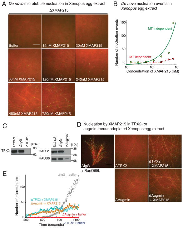 How microtubules (MTs) are generated in the cell is a major question in understanding how the cytoskeleton is assembled. For several decades, γ-tubulin has been accepted as the universal MT nucleator of the cell. Although there is evidence that γ-tubulin complexes are not the sole MT nucleators, identification of other nucleation factors has proven difficult. Here, we report that the well-characterized MT polymerase XMAP215 (chTOG/Msps/Stu2p/Alp14/Dis1 homologue) is essential for MT nucleation in Xenopus egg extracts. The concentration of XMAP215 determines the extent of MT nucleation. Even though XMAP215 and the γ-tubulin ring complex (γ-TuRC) possess minimal nucleation activity individually, together, these factors synergistically stimulate MT nucleation in vitro. The amino-terminal TOG domains 1-5 of XMAP215 bind to αβ-tubulin and promote MT polymerization, whereas the conserved carboxy terminus is required for efficient MT nucleation and directly binds to γ-tubulin. In summary, XMAP215 and γ-TuRC together function as the principal nucleation module that generates MTs in cells.