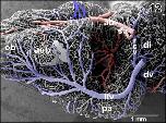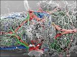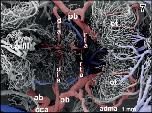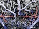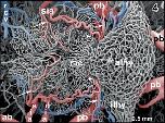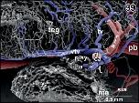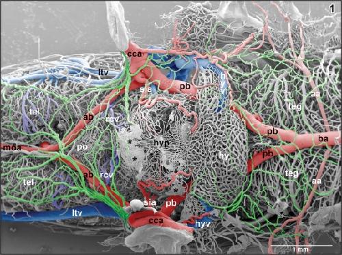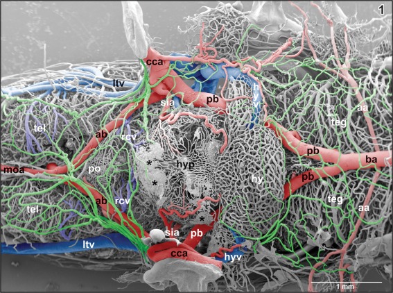 Figure 1. Microvascular anatomy of the brain in adult X. laevis. Vascular corrosion cast. SEM. Ventral view displaying telencephalic hemispheres (tel), preoptic area (pa), hypothalamus (hyp), hypophysis (hy), and mesencephalic and rhombencephalic tegmentum (teg). Arterial vessels are red, venous vessels are blue, and meningeal vessels are green. Asterisks mark extravasates. For further abbreviations in this and following figures see the list of abbreviations |