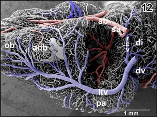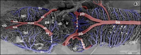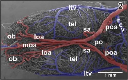 Figure 46. Microvascular anatomy of the accessory olfactory bulb (aob). Ventroâlateral view. Note the dense capillary bed supplied by a branch of the lateral olfactory artery (loa) and the drainage by ventral, lateral, and dorsal branches of the lateral telencephalic vein (ltv) |