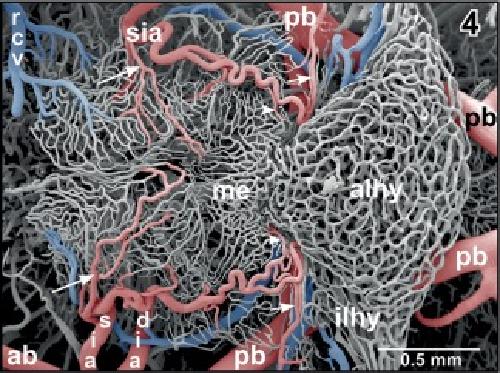 Figure 24. Arterial supply and venous drainage of the mesencephalon (parts of the rostral optic tecta are removed). Anterior is at bottom. Note the prominent anterior inferior mesencephalic arteries (aima) which first penetrate deeply into subependymal areas and then curve in a semicircular manner (arrows). Branches from the posterior superior mesencephalic arteries (psma) radiate from caudally deep into the optic tecta (arrowheads) |