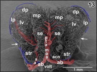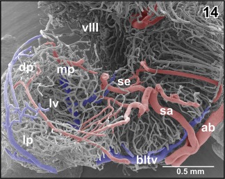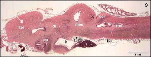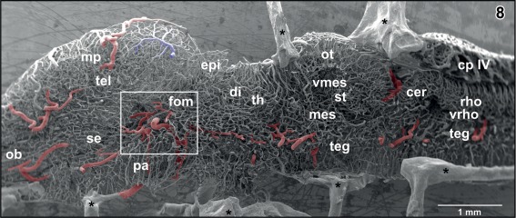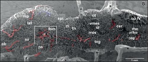 Figure 8. Internal microvascular anatomy of the brain of adult X. laevis. Sagittally sectioned vascular corrosion cast. Right half of the brain displaying telencephalon (tel), diencephalon (di) (without hypothalamus and hypophysis), mesencephalon (mes), cerebellum (cer), and rhombencephalon (rho). Asterisks mark conductive bridges |