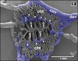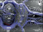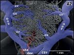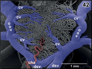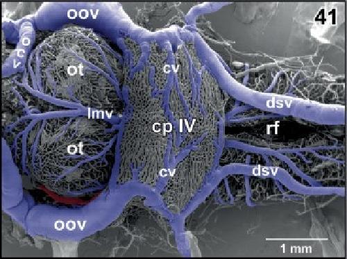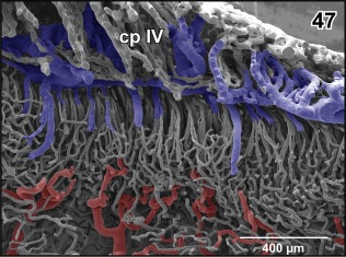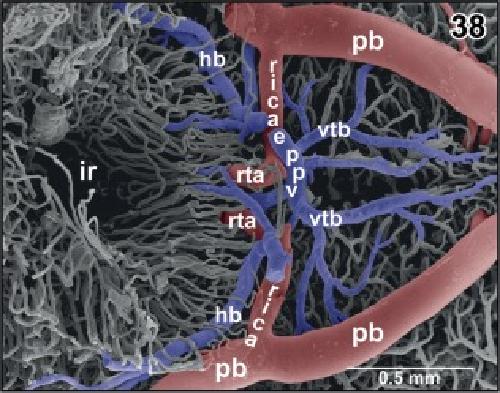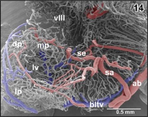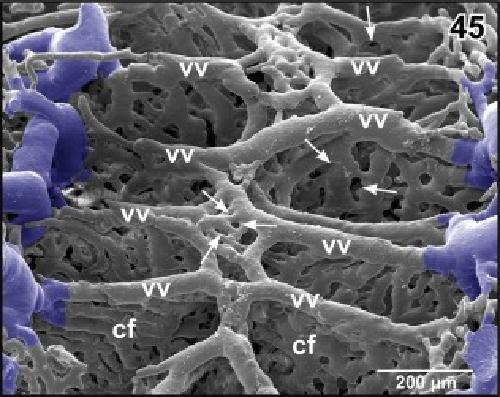 Figure 45. Detail from Figure 44. Vertical, transversely orientated choroidal folds (cf) made up from a dense 2D network of sinusoids. Choroidal folds reveal ventral venules (vv) which interconnect at the midline. Note the many sites of ongoing intussusceptive angiogenesis (arrows) |