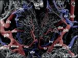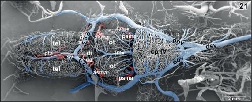 Figure 21. Microvascular anatomy of the brain of adult X. laevis. Dorsal view. Note the dorsal location of cranial veins |