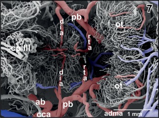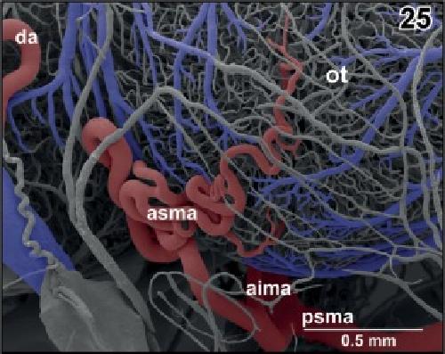 Figure 25. Origin and course of anterior superior mesencephalic artery (asma). Note the coiling of the artery at the rostrolateral area of the optic tectum (ot). Rostral is to the left |