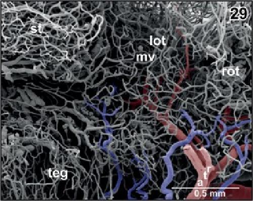 Figure 29. Course and branching pattern of branches of rostral tegmental arteries (rta). Note that caudal branches terminate in the lateral optic tectum (lot) and rostral branches in the rostral optic tectum (rot) |