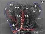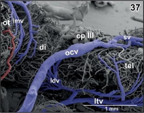 Figure 19. Microvascular anatomy of caudal dorsal (dp) and lateral pallium (lp), epithalamus (epi) and optic tectum (ot). Dorsoâlateral view. Note the prominent oblique cranial vein (ocv) and the medially located longitudinal mesencephalic vein (lmv) which by two tributaries (arrows) drains epithalamic, thalamic and rostral, and lateral areas of the optic tecta |
