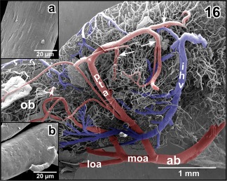 Figure 16. Obliquely ascending posterior telencephalic artery (pta) giving off a rostrally directed branch at the level of the dorsomedial pallium (arrowhead). The main trunk bends toward caudal and issues several branches (arrows). Inset a. Characteristic endothelial cell nuclei imprints (arrowheads) at the surface of a cast artery (posterior telencephalic artery). Imprints are longish and orientate parallel to the vessel axis. Inset b. Characteristic endothelial cell nuclei imprints (arrowheads) at the surface of a cast vein (interhemispheric vein). Imprints are oval to roundish and orientate randomly |
