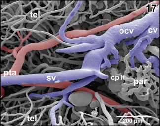 Figure 17. Bifurcation of the posterior telencephalic artery (pta) at the border area between medioâcaudal poles of telencephalic hemispheres (tel) and choroid plexus of the third ventricle (cp III) |
