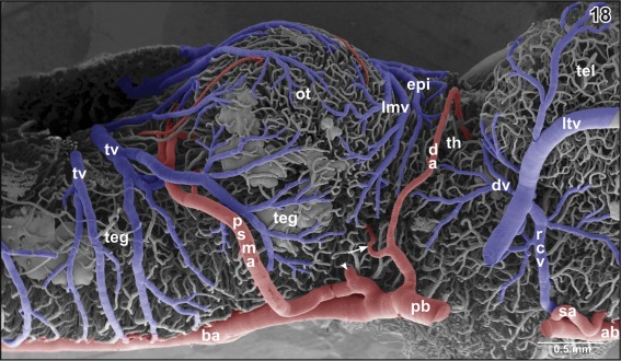 Figure 18. Microvascular anatomy of the pial surface of the posterior pole of the telencephalon (tel), epithalamus (epi), thalamus (th), optic tectum (ot), mesencephalic, and rhombencephalic tegmentum (teg). Lateral view. Rostral is to the right. Note the small caliber of the diencephalic artery (da) which shares a common stem with a lateral tegmental artery (arrow). The posterior superior mesencephalic artery (psma) shares a common stem with the inferior mesencephalic (tegmental) artery (arrowhead) |