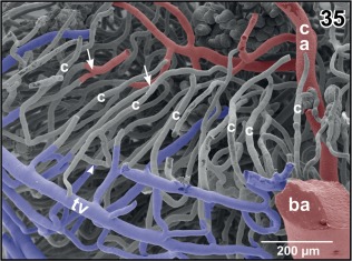 Figure 35. Radial arrangement of rhombencephalic tegmental capillaries (c). Detail from Figure 34 (box). Specimen slightly tilted. Note H‐shaped (arrowhead) and Y‐shaped (arrows) branchings |