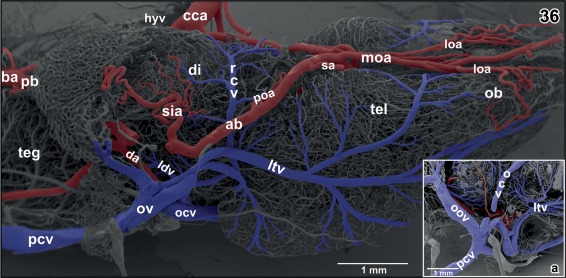 Figure 36. Gross arterial supply and venous drainage of olfactory bulb (ob), telencephalon (tel) and diencephalon (di). Ventroâlateral view. Rostral is to the right. Note the lateral telencephalic vein (ltv) and its dorsal and ventral tributaries. Inset a. Confluence of cerebral veins at the level of the prootic foramen. Lateral view |