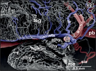 Figure 39. Vascular anatomy of the hypophysis. Longitudinal section through mesencephalic tegmentum and hypophysis. Note the drainage of the encephaloâposthypophysial portal system into the rostroâdorsal area of the posterior lobe of the hypophysis (plhy) |