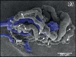 Figure 23. Isolated choroid plexus of the third ventricle. Same specimen as in Figure 22, but ventroâlateral aspect. The interhemispheric vein (asterisk) continues as wide sinusoid within the plexus. Note the many sites of ongoing intussusceptive microvascular growth (arrows) |