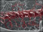 Figure 3. Anatomy of the vertebroâbasilar arterial system. Inset a. Communicating arteries (arrows) bifurcate before they join the basilar artery (ba) bilaterally. Inset b. Asymmetric junctions of left (1) and right (2) communicating arteries with the basilar artery (3). Asterisks mark conductive bridges |