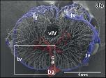 Figure 32. Vascular architecture of the rhombencephalic tegmentum (teg) and cochlearâvestibular nuclear regions (cvr). Slightly parasaggitally sectioned rhombencephalon. Rostral is to the right. Note origin, course and branching patterns of central arteries (ca). Inset a. Central arteries (arrowheads) branching off the lateral circumference of the basilar artery (ba). Inset b. Central arteries branching immediately after their origin from the basilar artery (arrowheads) |