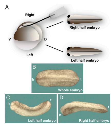 Fig. 1. Sagittal bisection of Xenopus blastulae with an eyelash knife generates twins. (A) Diagram showing that bisection by an eyelash knife (SI Appendix, Movie S1).