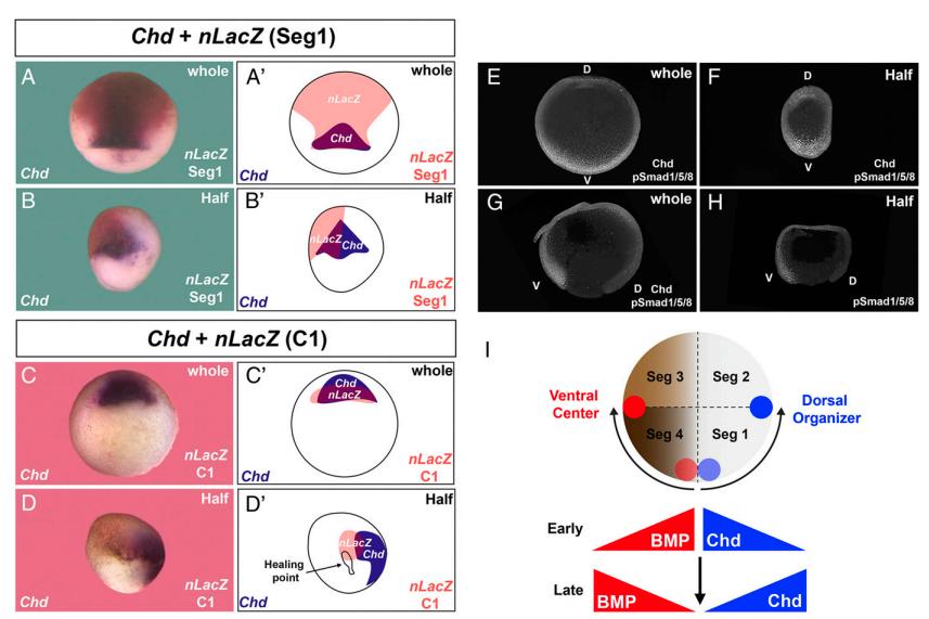 Fig. 7. Formation of the organizer and the ventral center was displaced in half embryos arising by sagittal bisection. (A and Aâ²) The organizer marker chd was expressed within the progeny of segment 1 (n = 65). Embryos were lineage labeled at 16-cell and cultured until gastrula. (B and Bâ²) In half embryos the chdexpressing region only partially overlapped with segment 1, indicating a displacement of the organizer from its normal location (n = 101, 9 independent experiments). (C and Câ²) The progeny of blastomere C1 at the 32-cell stage also overlapped with chd (n = 4). (D and Dâ²) In half embryos the chd+ organizer region was displaced at a distance from the original dorsal C1 region (n = 13); in this particular embryo the healing point at which the original dorsal- and ventral-most cells were juxtaposed was still visible, underscoring the extent of the displacement. (E) Staining with antiphospho-Smad1/5/8 antibody in whole embryos showing the ventral BMP gradient (n = 2). (F) The ventral center (high BMP signaling) was regenerated in half embryos; staining with Chd antibody (weaker because the much stronger pSmad1/5/8 signal required stopping the staining) indicated that both centers were formed opposite each other (n = 2). (G) Phospho-Smad1/5/8 signaling in sagittal sections of stage 12 gastrula embryos (n = 6). (H) Regenerated half embryo showing that the ventral (V) center was formed directly opposite the dorsal (D) blastopore lip (n = 4). Right-side half embryos are shown in B, D, and H, while a left-side half embryo is shown in F. (I) Hypothetical diagram indicating how the dorsal organizer and ventral center are displaced in opposite directions in half embryos. The original dorsal center region (light blue) is displaced 90° to the boundary between segment 1 and 2 (dark blue). The ventral center is also displaced from the region in segment 4 next to the healing point (light red) to the boundary between segments 3 and 4 (dark red). Early after healing at blastula the prospective regions of high BMP and high Chd signaling are juxtaposed in the half embryo. However, by the gastrula stage the dorsal and ventral centers are formed at a distance from their original location by the intercalation of a new D-V morphogen gradient. The 5à objective lens of LSM880 Zeiss confocal microscope was used for AâDâ² and the 40à digital magnification zoom of Axio Zoom V.16 Stereo Zoom Zeiss for EâH.
