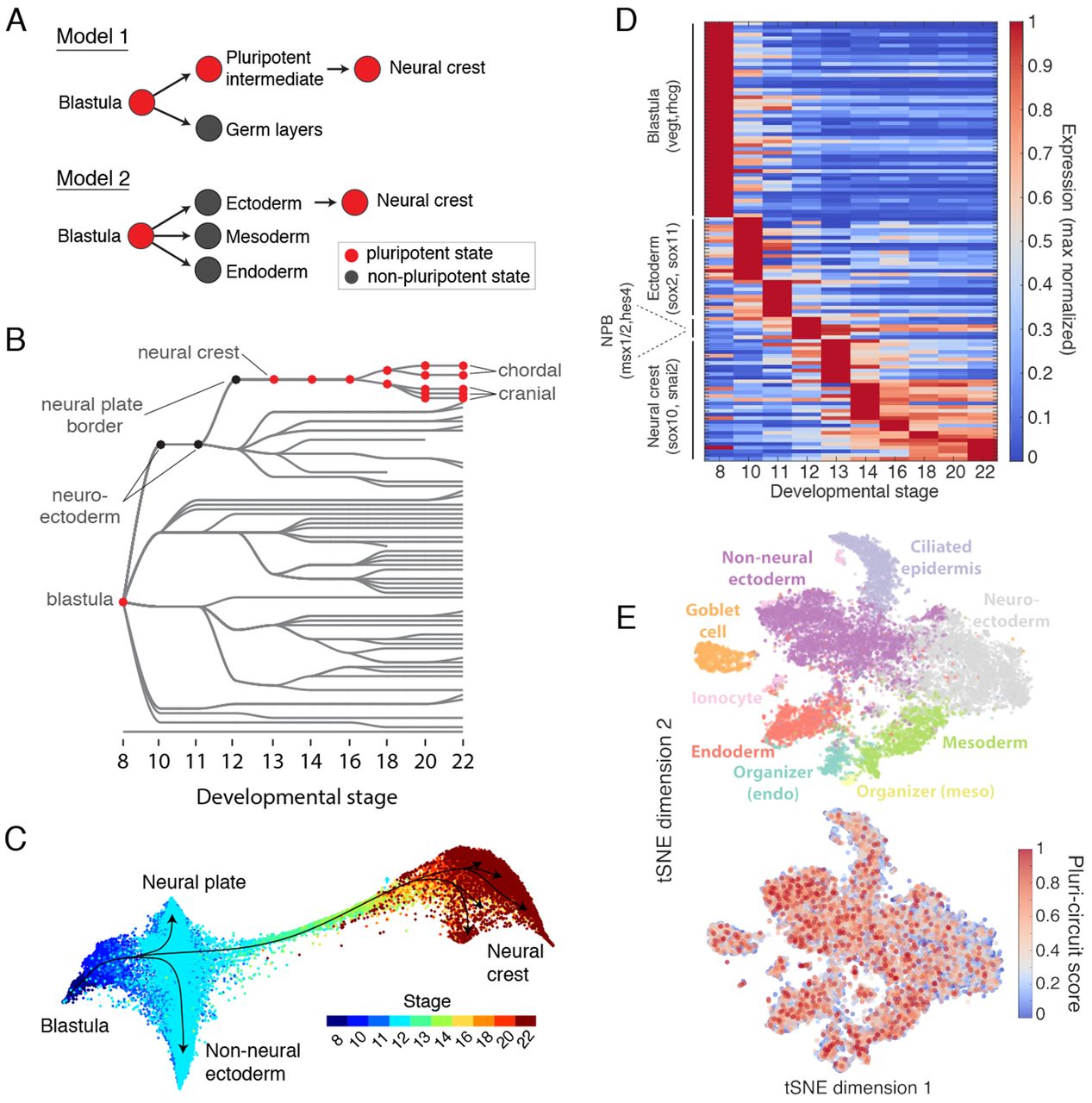 (A) Contrasting models of neural crest development. Model 1: neural crest emerges from an intermediate population that retains blastula pluripotency (29). Model 2: neural crest emerges from ectoderm and reactivates pluripotency. (B) Ancestors inferred from scRNA-seq support model 2, where neural crest derives from neural cells at the neural plate border. (C) Single-cell visualization (SPRING) of neuroectoderm, non-neural ectoderm, and neural crest also indicates that neural crest derives from the neural plate border. (D) Neural crest differentiation involves hundreds of >3-fold dynamic marker genes. (E) At stage 11, the shared pluripotency circuit proposed by Buitrago-Delgado et al. (30) - foxd3, c-myc (myca), id3, tfap2a, ventx2.1, ets1, and snai1 and pou3f5.2 - is expressed broadly in nonpluripotent cells. Score shows normalized aggregate expression; see fig. S18 for individual genes.