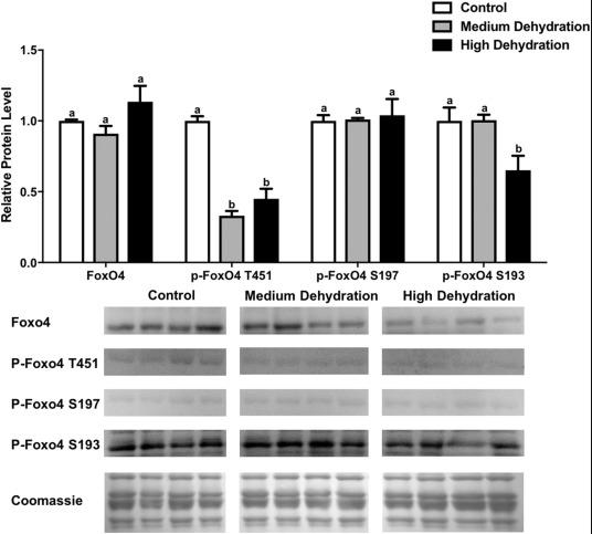 Fig. 2. Changes in total FoxO4, as well as phosphorylated FoxO4 Thr451 (T451), Ser197 (S197), and S193 protein levels in the skeletal muscle of X. laevis during dehydration stress. Total FoxO4 as well as p-FoxO4 T451, S197, and S193 protein levels were visualized at three sampling points: control, medium dehydration, and high dehydration. Western blots and Coomassie total protein loading controls representative of the results are shown for the three sampling points. Also shown are histograms with mean standardized band densities (±S.E.M., nâ¯=â¯4 independent protein isolations from different animals). Data was analyzed using a one-way analysis of variance with a post hoc Tukey's test (pâ¯<â¯0.05); for each parameter measured, values that are not statistically different from each other share the same letter notation.