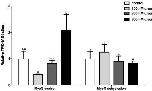 Fig. 6. The effects of adjusting temperature on the transcription factor-DNA binding affinities of FoxO4 and MyoG. Transcription factor-DNA binding was measured at 37 and 21â¯Â°C (room temperature) at the control and high dehydration sampling points for FoxO4 and MyoG. Modified DPI-ELISA absorbance readings were corrected by subtraction of negative controls containing no protein, and values were expressed relative to 37â¯Â°C for FoxO4 and MyoG at both sampling points. Histograms show mean relative valuesâ¯Â±â¯S.E.M., nâ¯=â¯4 independent biological replicates for both experimental conditions. Data was analyzed using unpaired t-tests (pâ¯<â¯0.05); to test for the effect of temperature change on each target at each sampling point, *indicates a significant difference from 37â¯Â°C.