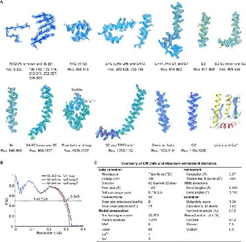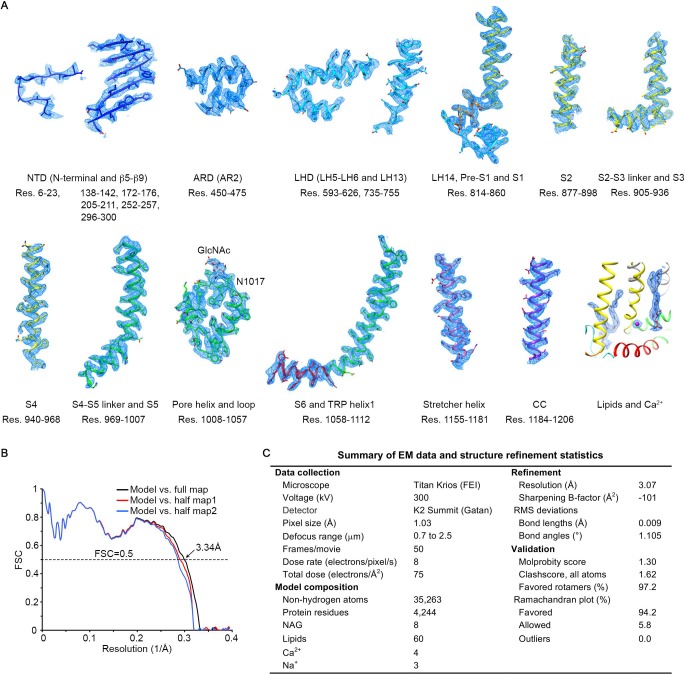 Figure 2—figure supplement 2. Validation of the atomic model.(A) Local EM density maps and fitted atomic models for representative regions of the structure. (B) Fourier shell correlation (FSC) curves between the model and different maps. The model was refined against half map1. (C) Summary of data collection parameters and structure refinement statistics. |