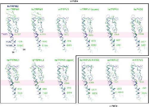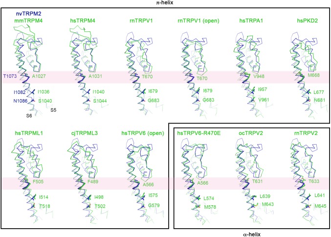 Figure 3âfigure supplement 3. Alpha-pi-alpha helical transition in S6 of TRP family channels.Pairwise structural superposition of the pore domain of one nvTRPM2 subunit (blue) with those of other TRP channels (green), including mm (Mus musculus) and hs (Homo sapiens) TRPM4 (PDB: 6BCJ and 6BQV), rn (Rattus norvegicus) TRPV1 (PDB: 5IRZ and 5IRX), hsTRPA1 (PDB: 3J9P), hsPKD2 (PDB: 5T4D), hsTRPML1 (PDB: 5WJ5), cj (Callithrix jacchus) TRPML3 (PDB: 5W3S), hsTRPV6 (PDB: 6BO8 and 6BOA), oc (Oryctolagus cuniculus) TRPV2 (PDB: 5AN8), and rnTRPV2 (PDB: 5HI9). The two structures that are in the open conformation are indicated, all other structures represent the closed conformation. The α- to Ï-helix transition regions in S6 are shown as thicker ribbon and highlighted with pink bands. Structures that are Ï- or α-helical in this region are boxed separately. In all structures the residue corresponding to the alanine gating hinge of TRPV6, and the two residues that form the lower gate, are labeled and shown with side chains. |