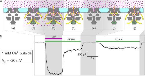 Figure 6. Activation by ADPR of nvTRPM2 current in the presence of external but absence of cytosolic Ca2+.(A) Cartoon interpretation of the molecular events that occur during consecutive time intervals (sections a-g, also identified by intermittent gray shading in (A)-(B)) of the current recording in (B). Membrane, light cyan; nvTRPM2 protein, dark gray; Ca2+ ions, magenta spheres; ADPR, green letters ‘A’; direction of Ca2+ flow, yellow arrows. (B) In the presence of 1 mM external Ca2+, at −20 mV membrane potential, a fraction of the macroscopic nvTRPM2 current evoked by cytosolic exposure to 100 μM ADPR +125 μM free Ca2+ survives cytosolic Ca2+ removal, and subsides only upon removal of ADPR (see Figure 5E). A second application of 100 μM ADPR, without cytosolic Ca2+, activates a current comparable to that which survived prior Ca2+ removal. Note delayed current activation following exposure to ADPR alone. |